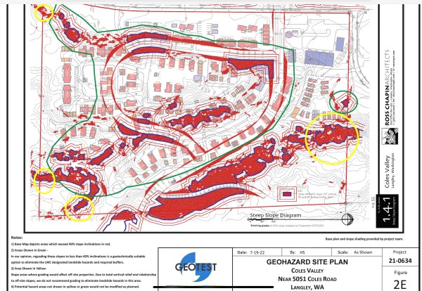 South Whidbey LLC (SWLLC) is a Bellingham based company. Bob Libold, formally of Trillium, NJB Development and Pacific Crest Partners sold the parcel to newly formed SWLLC (Libold and Ken Hertz) in 2010 for ten dollars. The 40 acres is located at “near” 5501 Coles Road, next to the Langley Wastewater Treatment Plant. The parcel was previously annexed by the city of Langley in 2006 and approved for 24 homes. The recent development application (August 24, 2022) is for 161 mixed housing units and multiple commercial buildings. The proposed development plans to deforest the acreage, remove most of the critical slopes, place sewer/water lines, and roads. The 28 acre area will then be divided into seven subplots and sold to unidentified developers.