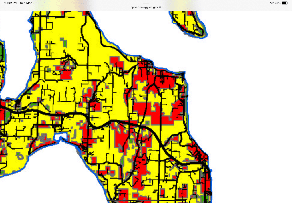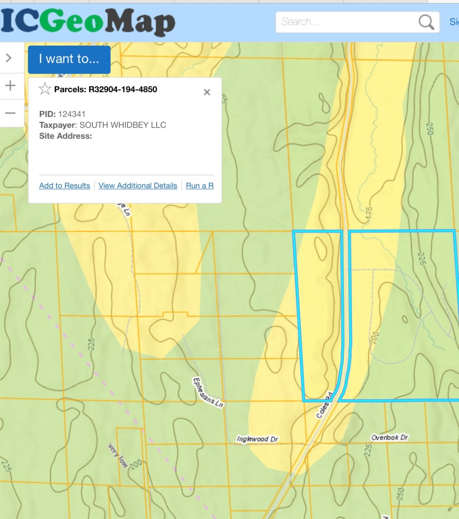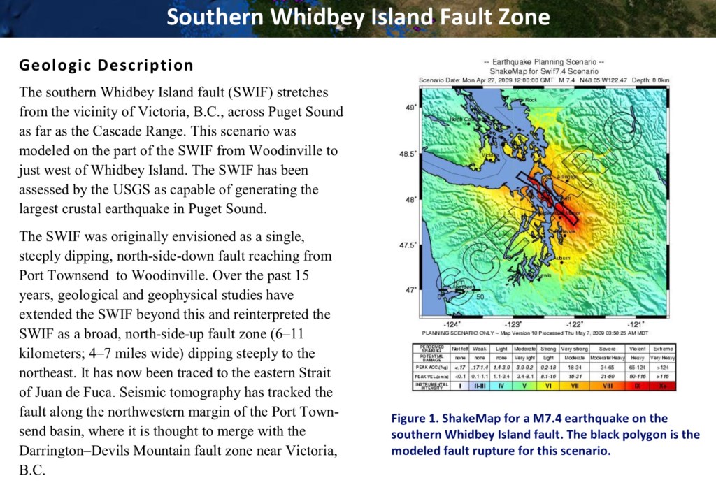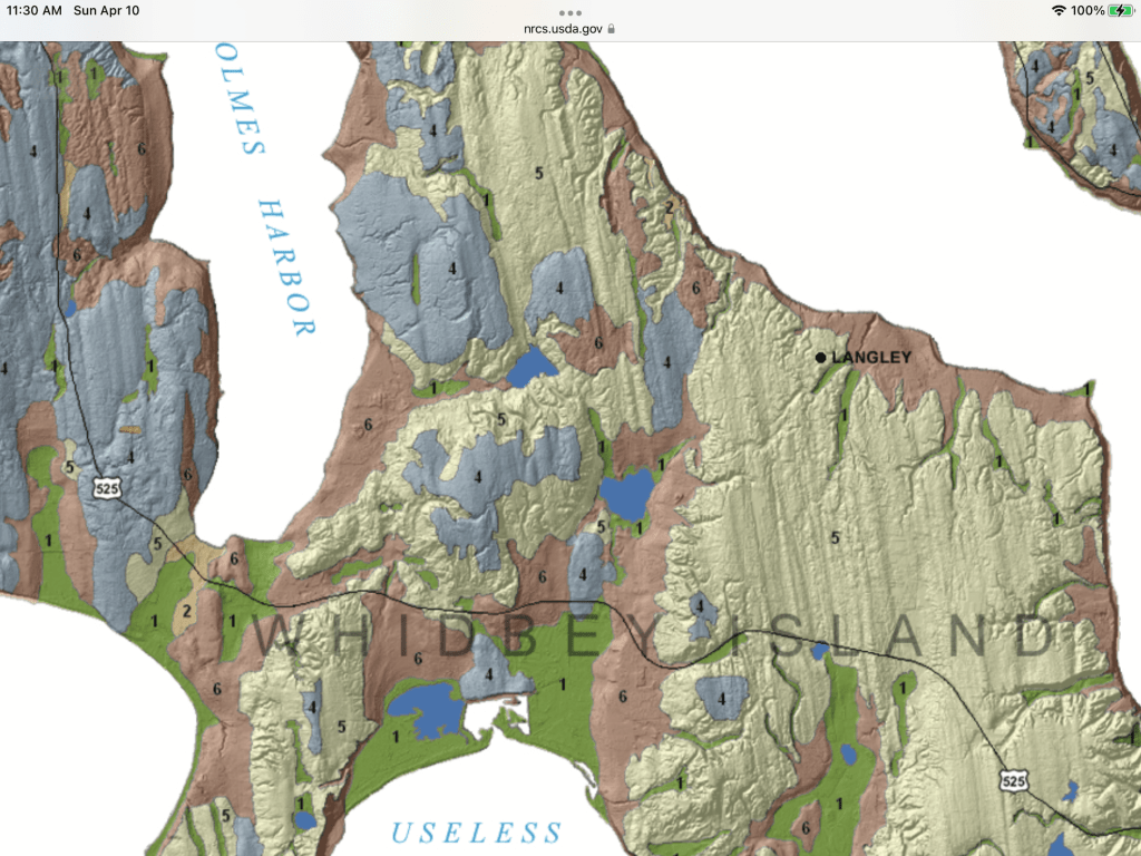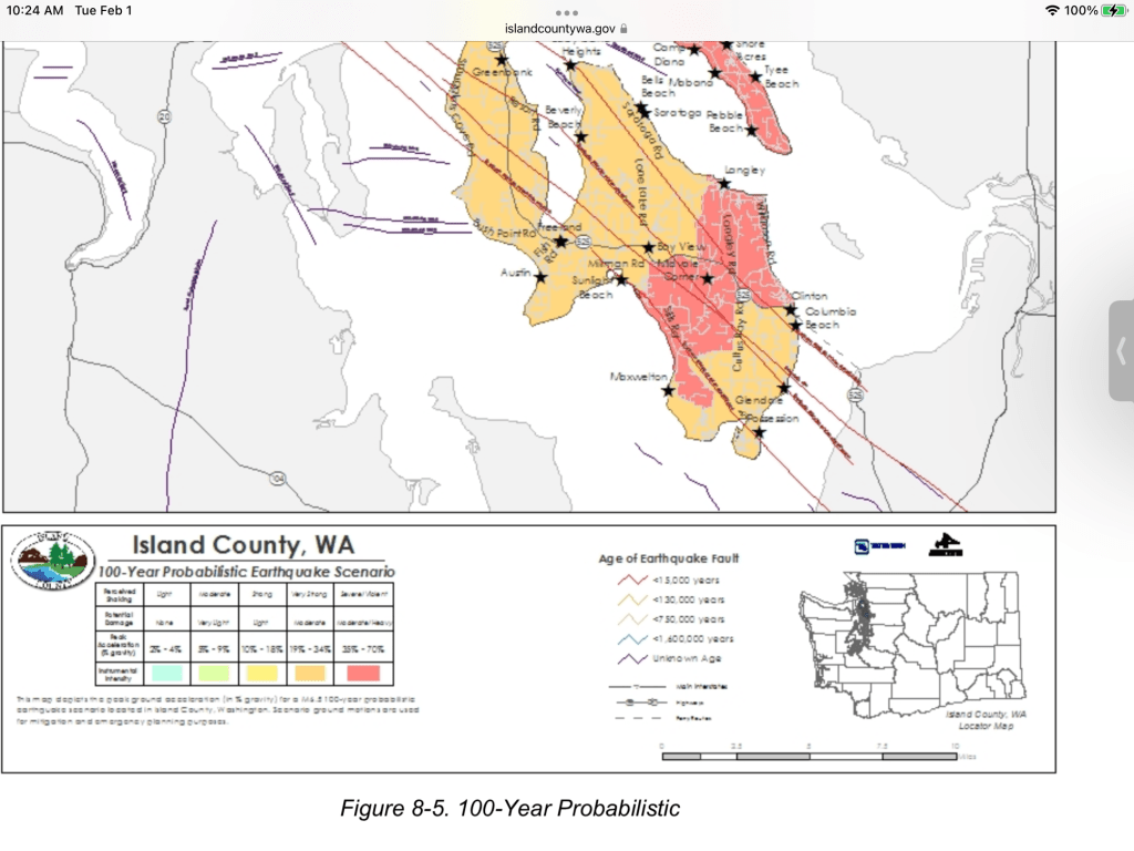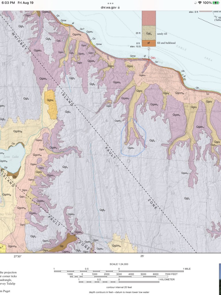 Map is soil geology of Langley and development area. WA DNR image shows the sandy glacial valleys (light brown Qgof) and uplands. The South Whidbey EQ fault is .25 miles from SW corner of development. Soil is same as the wetland, sand and Norma silt loam. The type of soil is known for liquefaction. Paleoseismology: Radiocarbon and stratigraphic data collected from sites on either side of the SWIF on Whidbey Island showed that the sea-level histories of the two sites were not comparable. Instead, the relative sea-level curves diverged 3,200 to 2,800 years ago, suggesting 1 to 2 meters of uplift along the north side of the fault. This suggests the fault has been active in the past. Based on these calculations, researchers concluded that the SWIF is capable of producing a magnitude 6.5 to 7.0 earthquake.