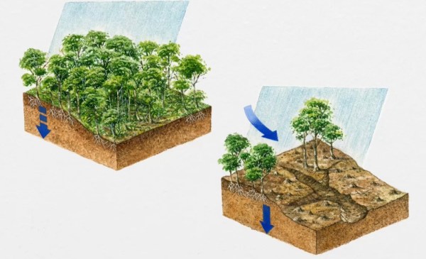 - Increases the risks of soil erosion. Trees slow down water currents, preventing rill formation, this is why clear-cutting increases erosion.