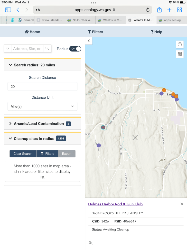 The 1986 Island County Groundwater Quality Assessment and Monitoring Program. Download below. It characterizes the water quality in the vicinity of nine county waste disposal sites and design groundwater monitoring programs for the health department. Starting on page 50 (page 126 of pdf), with several diagrams, the Langley Dump site is described in detail. It explains the size of the dump, that dumping continued after 1986, low water table in valley, steps to monitor.